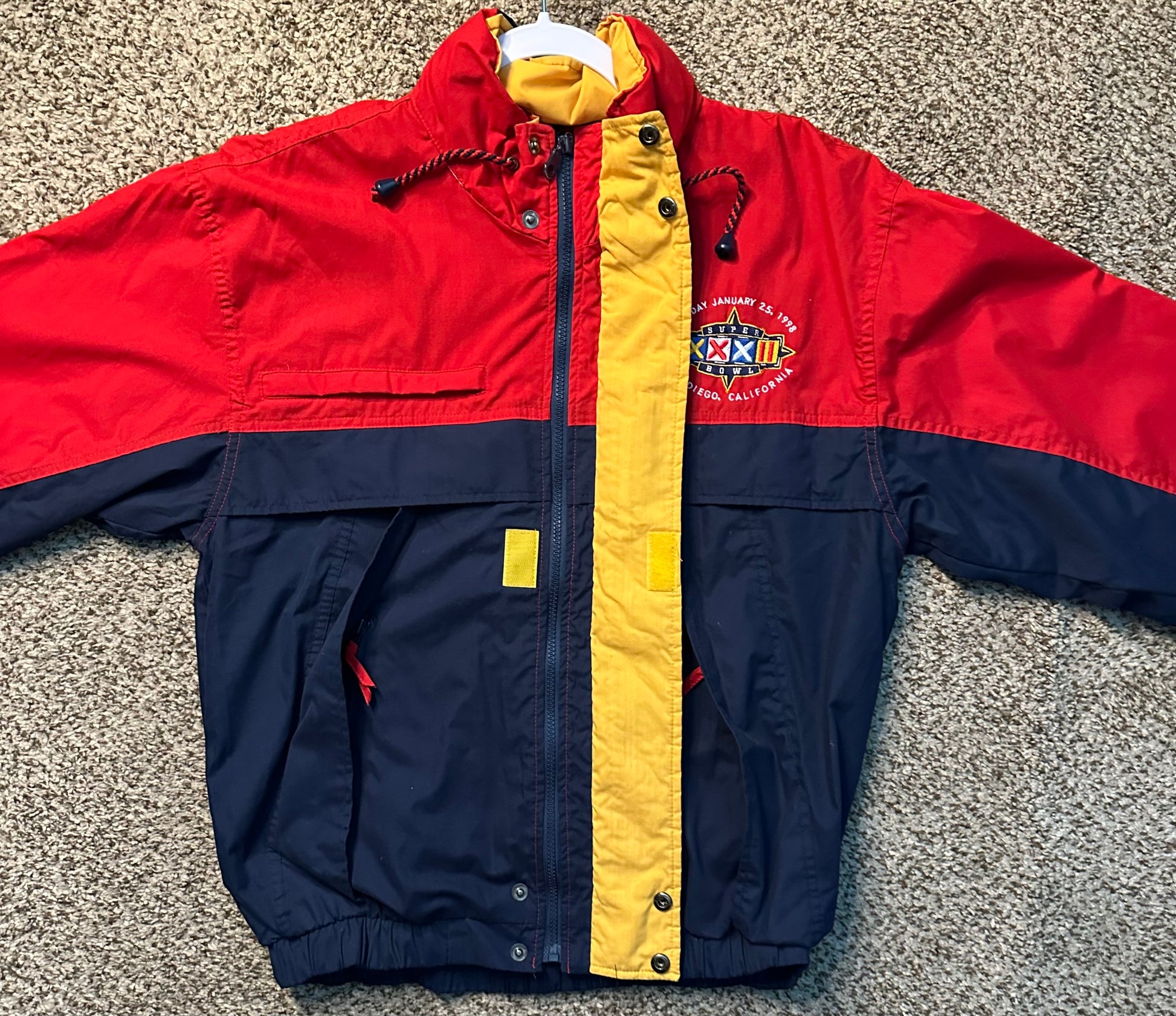 Vintage 1998 Denver broncos Super Bowl 32 windbreaker. Features roll up hood.